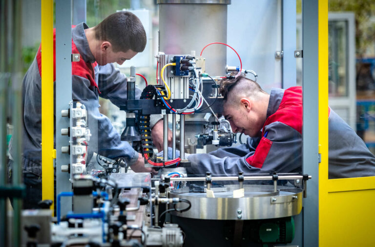 L’élève travaille sur un plateau technique en conditions réelles : 2 lignes de production, espace de fabrication et de soudage, salles informatiques avec logiciels de CAO et d’automatisme.